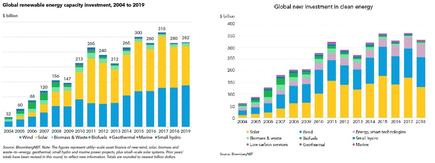 Let's see some data. The figures provided by Bloomberg New Energy Finance on the quantity of investments dedicated to renewable energy alone, show how in 2019 they reached 282 billion dollars, with +1% compared to 2018. The figure discounted some critical issues in the photovoltaic sector, due in particular to the strong contraction in the Chinese market. However, it should not be forgotten that, in 2017, the figure was very good, with 315 billion dollars invested, as well as in 2015 with the achievement - for the first time - of 300.